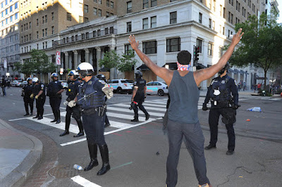 The demonstration was to protest the killing of a black man, George Floyd, by police in Minnesota, and to express rage and frustration with the Trump administration's racist statements and policies.
